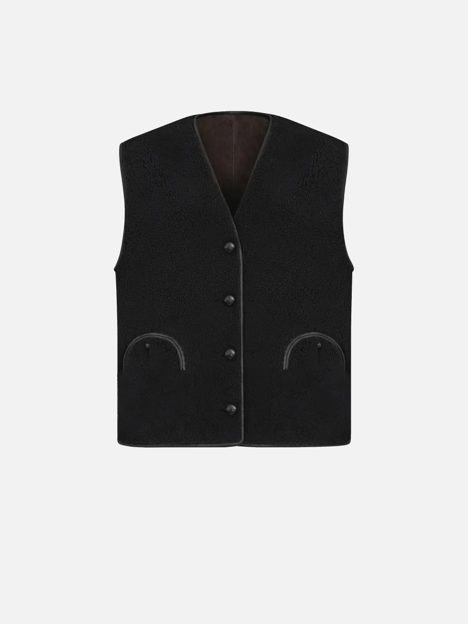 Reversible leather-trimmed brown shearling vest This straight-cut gilet in dark brown shearling with leather trim and tortoiseshell-effect buttons pairs wonderfully with the dark brown polo shirt. - Slightly relaxed fit - Dark brown shearling - Tortoiseshell-effect buttons - External Smiley pockets 100% Lambskin Shealing Made in Italy