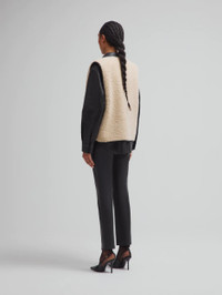 Reversible leather-trimmed camel shearling vest This straight-cut gilet in camel shearling with leather trim and tortoiseshell-effect buttons pairs wonderfully with the dark brown polo shirt. - Slightly relaxed fit - Camel shearling - Tortoiseshell-effect buttons - External Smiley pockets 100% Lambskin Shealing Made in Italy