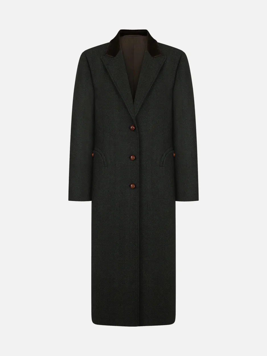 Women’s long dark green herringbone wool coat An essential for the winter season, BLAZE Milano’s Cheveyo Heck Coat reinterprets the classic tailored overcoat with a contemporary twist. Crafted from dark green herringbone wool, it stands out with its slightly oversized cut, peak lapels, and velvet collar, which adds a luxurious, textured finish. - Single-breasted - Slightly oversized fit - Padded shoulders - Corduroy collar - Peak lapels - Lacquered leather loden-effect buttons - External Smiley pockets - Back vent - Dark chocolate lining with logo motif 100% Virgin wool Lining: Viscose Made in Italy