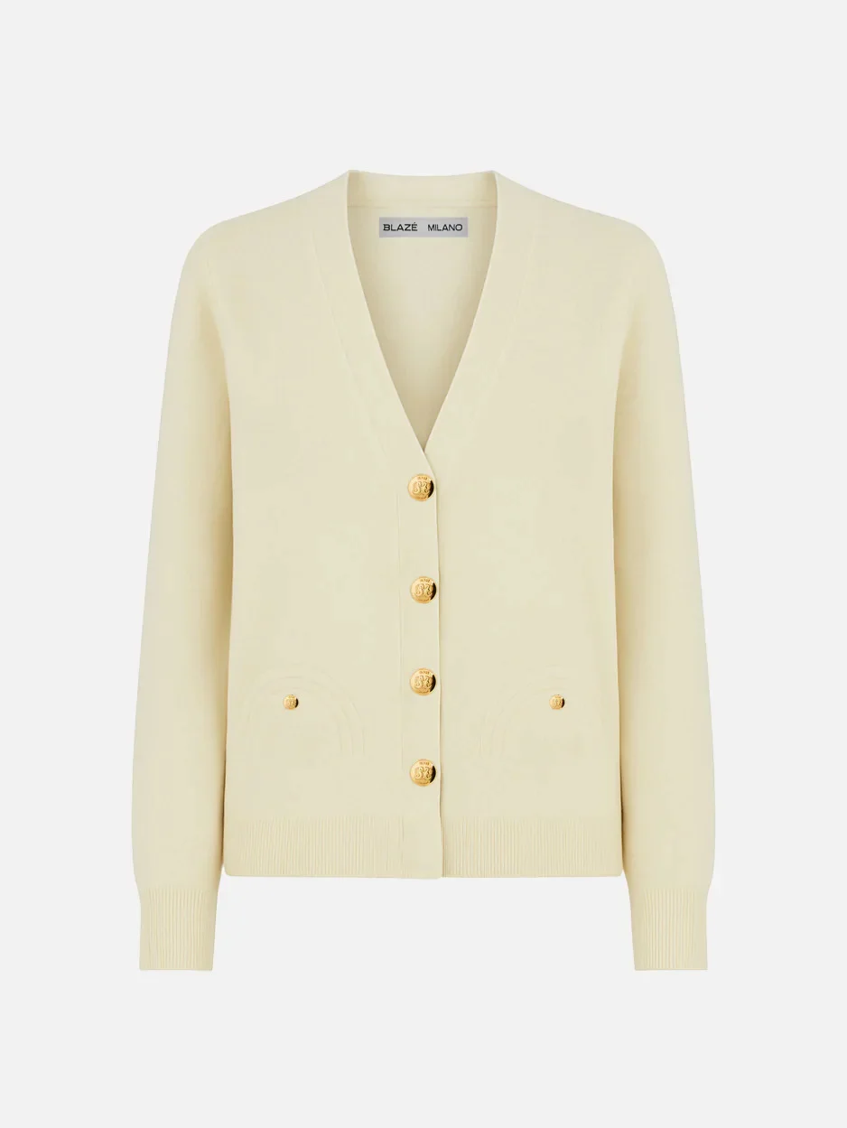 Women’s cream cardigan in wool and cashmere blend A luxurious, relaxed-fit wool and cashmere blend cardigan featuring Smiley pockets and gilded buttons embossed with the brand’s emblem. It’s a versatile, year-round wardrobe staple. - Designed for a loose fit - V-kneck - Crest-embossed metal buttons fastenings through front - Ribbed cuffs and hem - Smiley outer pockets 70% Wool 30% Cashmere Made in Italy