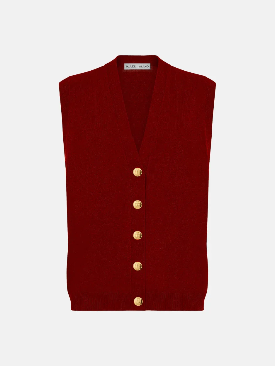 Women’s dark red gilet in wool and cashmere blend From the BLAZE Milano Knitwear line, a wool/cashmere blend knit gilet, with a V-neck and gilded buttons with the brand’s emblem. - V-neck - Gilded buttons with the brand’s emblem 70% Wool 30% Cashmere Made in Italy