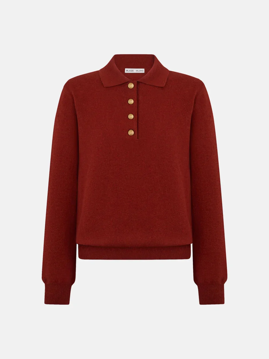 Women’s dark red polo sweater in wool and cashmere blend The Highland Polo is a wool/cashmere blend shirt with a classic polo collar and a row of gilded buttons with the brand’s emblem. Ribbed elasticized cuffs and hem. - Straight point collar - Gold-tone metal logo buttons - Ribbed cuffs and hem 70% Wool 30% Cashmere Made in Italy