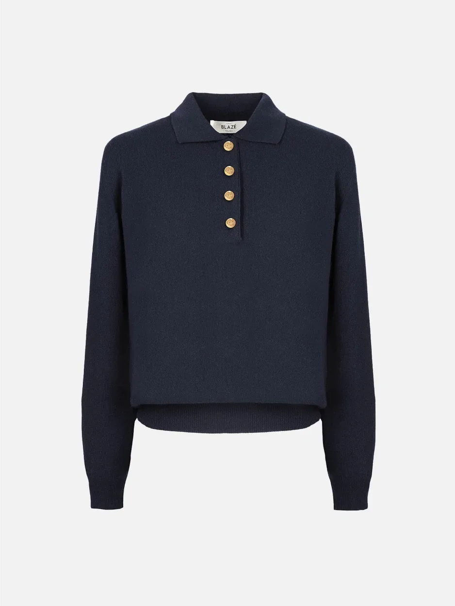 Women’s navy polo sweater in wool and cashmere blend Crafted from a soft cashmere and wool blend, BLAZE Knitwear presents the Highland Polo; with ribbed details, a classic straight collar, and the brand's seahorse crest-embossed buttons for an unmistakable touch. Available in navy, pink, red, and grey. - Straight point collar - Gold-tone metal logo buttons - Ribbed cuffs and hem 70% Wool 30% Cashmere Made in Italy
