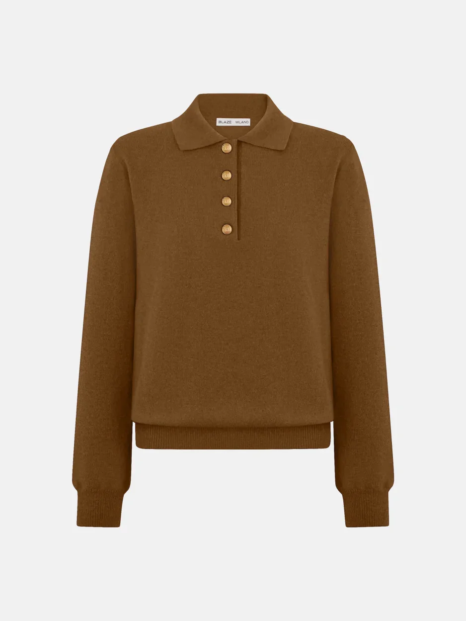 Women’s brown polo sweater in wool and cashmere blend The Highland Polo is a wool/cashmere blend shirt with a classic polo collar and a row of gilded buttons with the brand’s emblem. Ribbed elasticized cuffs and hem. - Straight point collar - Gold-tone metal logo buttons - Ribbed cuffs and hem 70% Wool 30% Cashmere Made in Italy