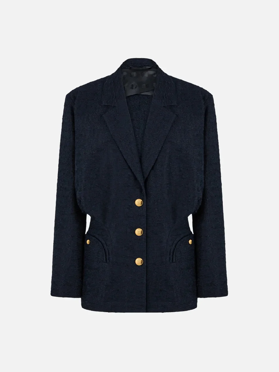 Women’s fitted navy cotton-blend blazer with back draping Debuting in the Resort 2026 collection, the Honeybell Blazer reimagines the classic navy blazer with a silhouette that defines the waist and falls into an elegant drape at the back. Crafted from a textured fabric in timeless navy and finished with gold-tone buttons, it is an effortless wardrobe essential—perfect over denim or tailored trousers. - Single-breasted - Fitted at the waist, loose at the top - Notched lapels - Gold-tone buttons with embossed logo - External Smiley pockets, two internal pockets - Back drape - Blue navy lining with logo motif 55% Cotton 29% Viscose 13% Polyamide 3% Linen Lining: Viscose Made in Italy