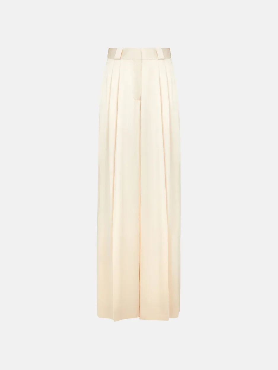Women’s palazzo pants in ivory satin with front pleats Crafted from smooth satin in a soft ivory hue, the 'Novalis' Husi Pants feature a high waist and pleated details, enhancing the draped, wide-leg silhouette. They can be paired with the matching gilet or blazer. - High-rise, cut for a wide-leg fit - Front pleats - Belt loops - Concealed zip and hook fastening - Smiley back pocket 52% Viscose 28% Acetate Lining: 100% Viscose Made in Italy