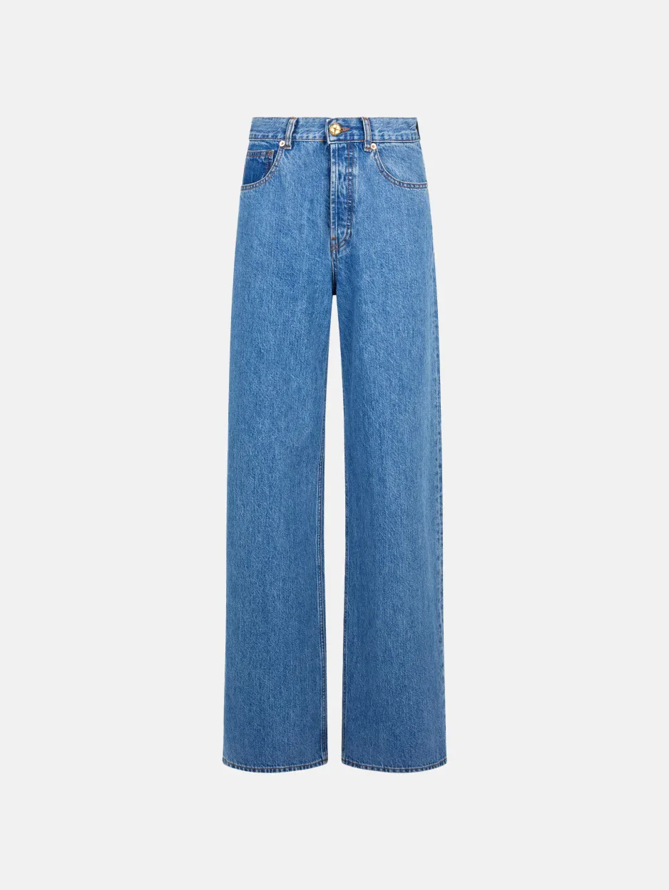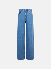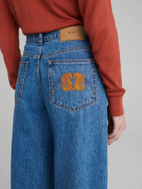 High-rise wide-leg blue jeans BLAZE Denim introduces the Nariida Maya Java Jeans, offering the most relaxed feel yet. Crafted in a baggy wide-leg shape from soft cotton denim in a classic blue wash, they feature the brand's signature Smiley design stitched on the back pockets for a distinctive touch. - High-rise, cut for a wide-leg fit - Belt loops - Concealed zip and button fastening - Back pockets stitched with the brand Smiley design and embroidered logo 100% Cotton Made in Italy
