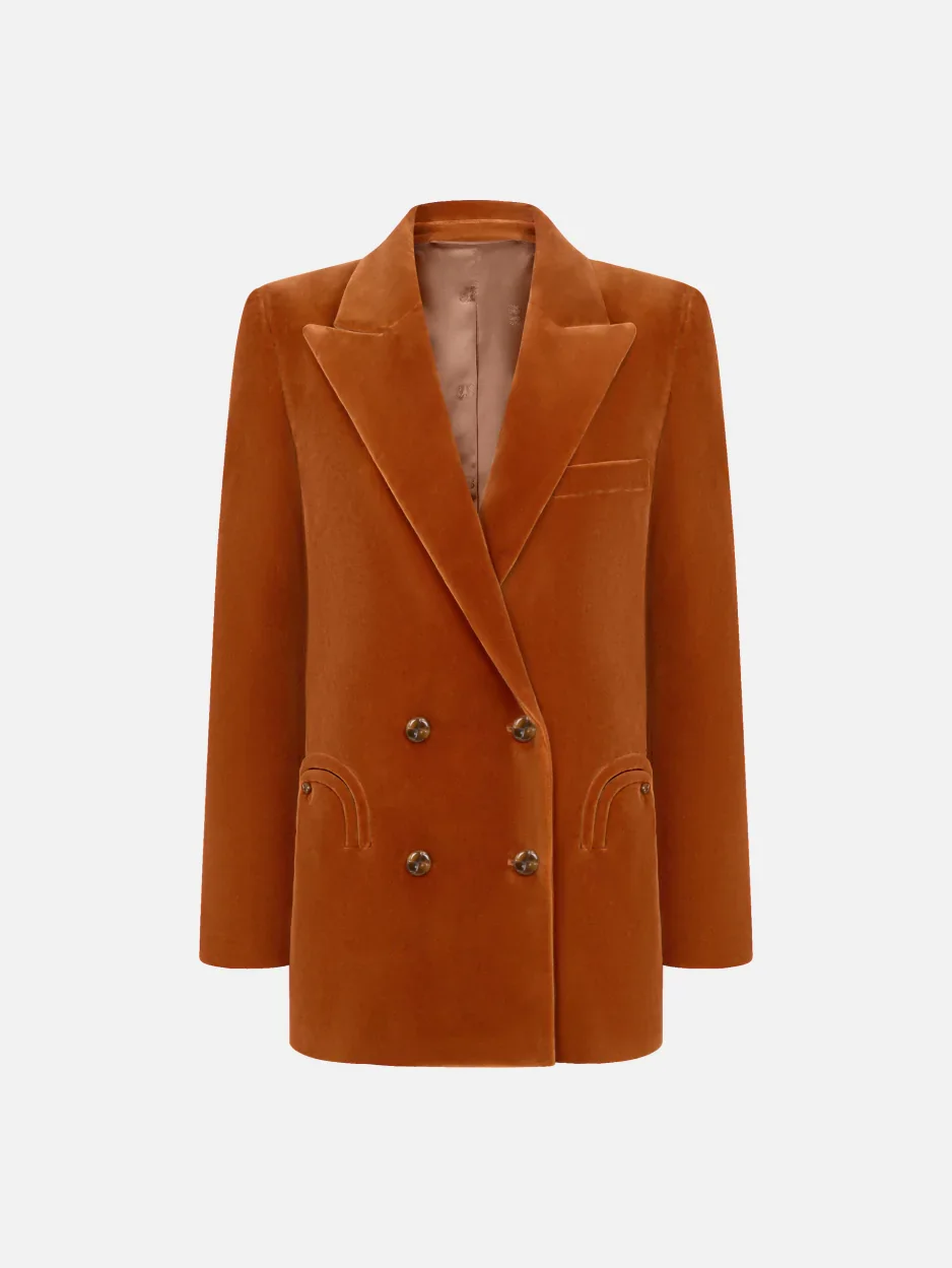 Double-breasted oversize cotton velvet orange blazer A double-breasted blazer in a pumpkin hue, with subtly padded shoulders and an oversized fit that makes it a mid-season must. To wear with matching trousers for an elegant look sure to make an impact. - Double-breasted - Oversized, boxy cut - Lightly padded shoulders - Pink lining - Loden-effect buttons - Peak lapels - External Smiley pockets and four internal welt pockets 100% Cotton Lining: Viscose Made in Italy