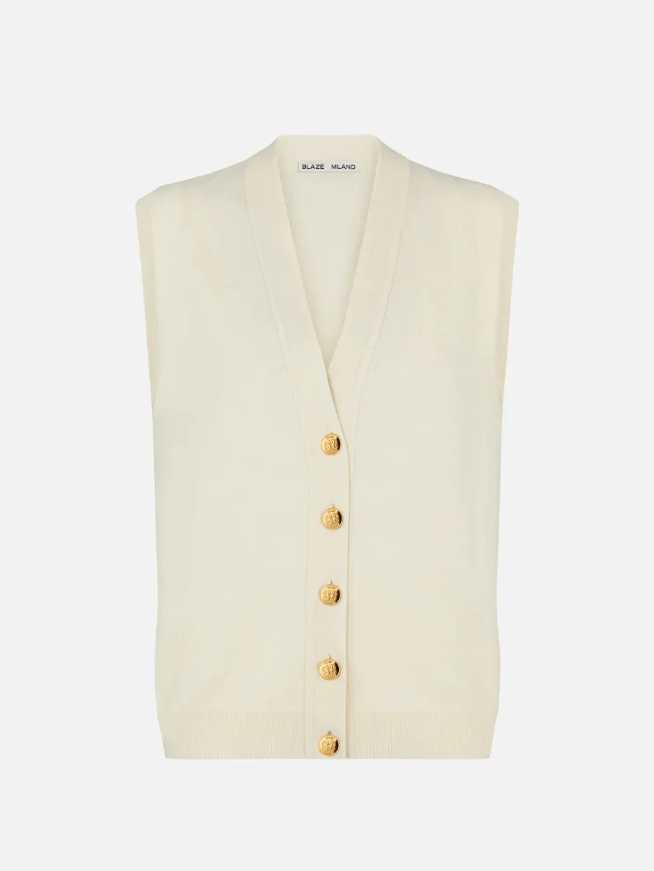Women’s vest in butter-colored wool, silk and cashmere In this season’s key neutral shade, the Maine Gilet by BLAZE Milano is crafted from an enveloping blend of wool, cashmere and silk. Elegant worn on its own as a statement piece or layered under a blazer, it nods to classic menswear tailoring with a refined, contemporary touch. - Relaxed fit - V-neck - Gold-tone buttons with embossed logo - Ribbed hem 70% Wool, 20% Silk, 10% Cashmere Made in Italy