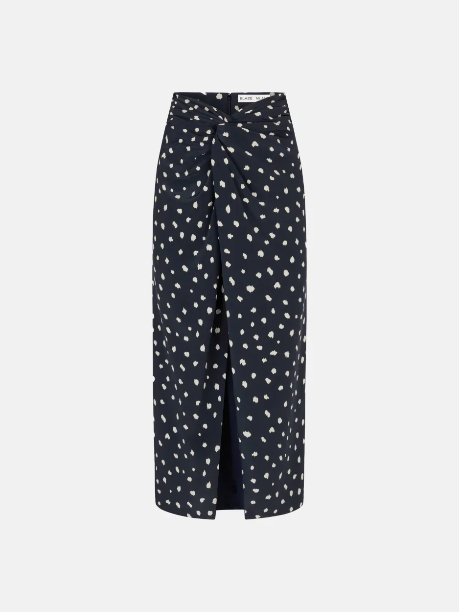 Navy silk white polka dots midi skirt with front knot detail Midi skirt with a gathered knot and slit in front. In white-dot-print silk, it’s ideal to wear with the matching shirt. - Midi length, designed for a slim fit - Wrap design with knot detail - Front slit - Concealed zip fastening along back 100% Silk Made in Italy