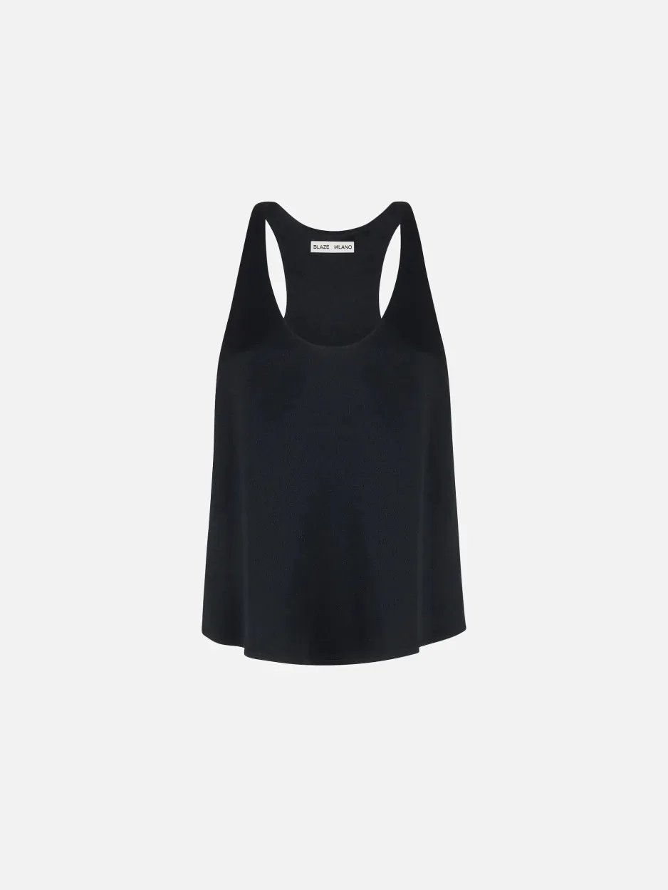 Dark navy halter-neck top with round neckline Perfect under a blazer or on its own, the Merens Top in satin by BLAZE Milano is a comfortable, feminine and versatile piece, easy to pack and simple to style. Its smooth handfeel, luminous finish and deep navy hue make it a seamless addition to any wardrobe. - Relaxed fit - Halter neckline at the back, round neckline at the front - Tone-on-tone embroidered logo on the back 52% Viscose 48% Acetate Lining: Viscose Made in Italy