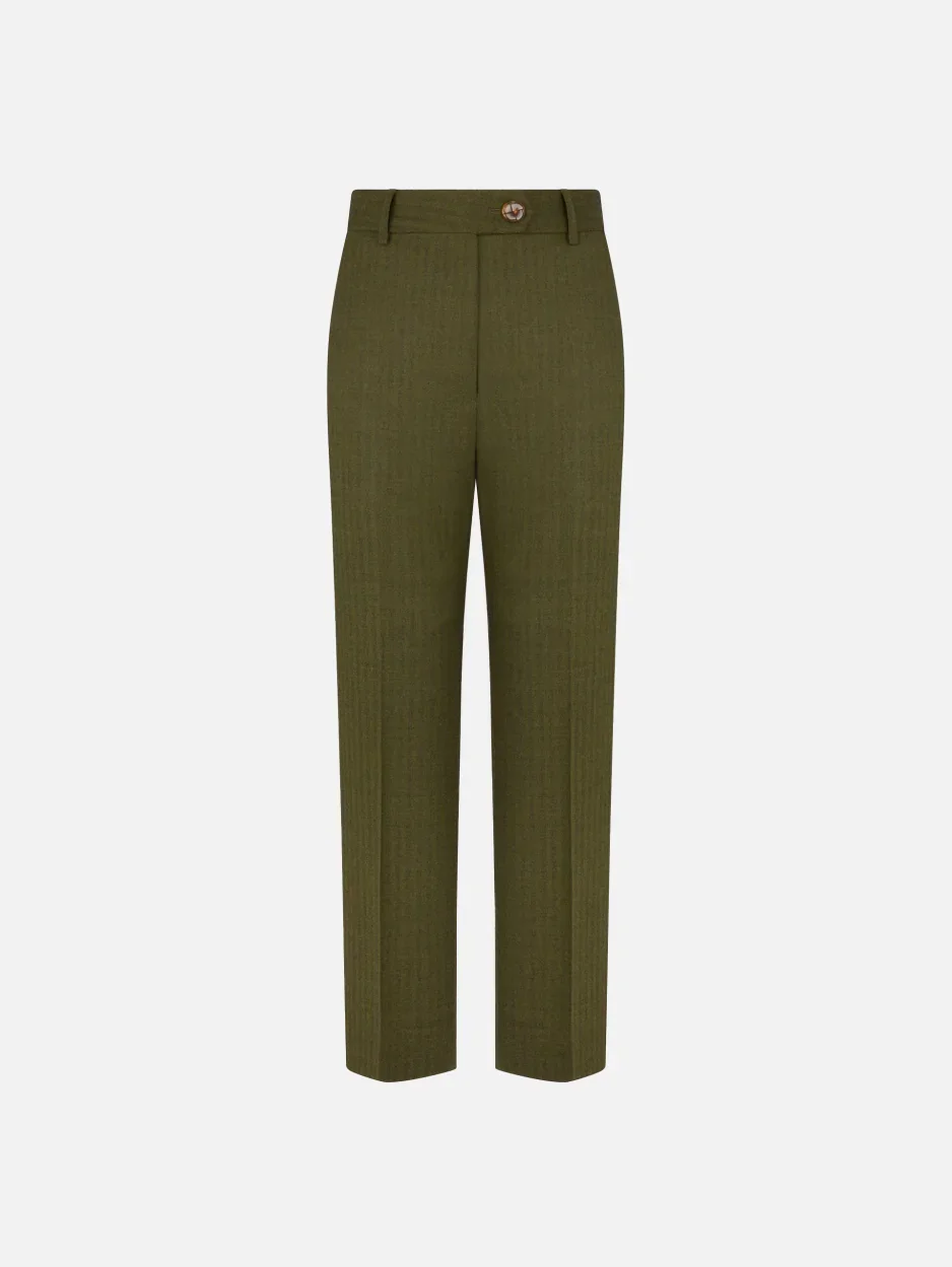 Women’s high-rise trousers in olive green wool BLAZE Milano’s Nana Pants, crafted from olive green wool with a micro-chevron pattern, are a chic and versatile style to wear throughout the season. Paired with the Anouk Green Blazer, they create a tailored ensemble with understated yet distinctive charme, ideal for both office hours and leisure time. - High-rise, tailored cut - Straight leg, ankle length - Front crease - Concealed zip fastening with internal hook and tortoiseshell-effect buttons - Belt loops - Decorative back Smiley pockets - Dark chocolate lining with logo motif 98% Virgin wool 2% Elastane Lining: Viscose Made in Italy