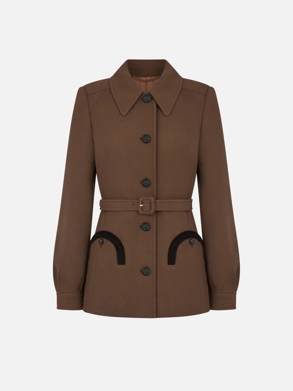 Women’s hourglass brown wool crepe belted jacket The Paint Jacket fuses couture precision with a utility spirit, crafted in chocolate wool crepe. The traditional hunting jacket is reinterpreted through a slim silhouette, emphasised by lightly padded shoulders and a waist belt that sculpts and enhances the figure. With its sophisticated allure, it is a versatile piece to wear day-to-day or to add an unexpected twist to elegant outfits. The velvet-trimmed Smiley pockets deliver BLAZE Milano’s signature touch. - Single-breasted - Hourglass shape - Slim fit - Lightly padded shoulders - Straight-point collar - Non-removable waist belt with fabric-covered buckle - Sleeves with buttoned cuffs - Black loden-effect buttons - Smiley pockets trimmed in velvet - Dark chocolate lining with logo motif 100% Virgin wool Lining: Viscose