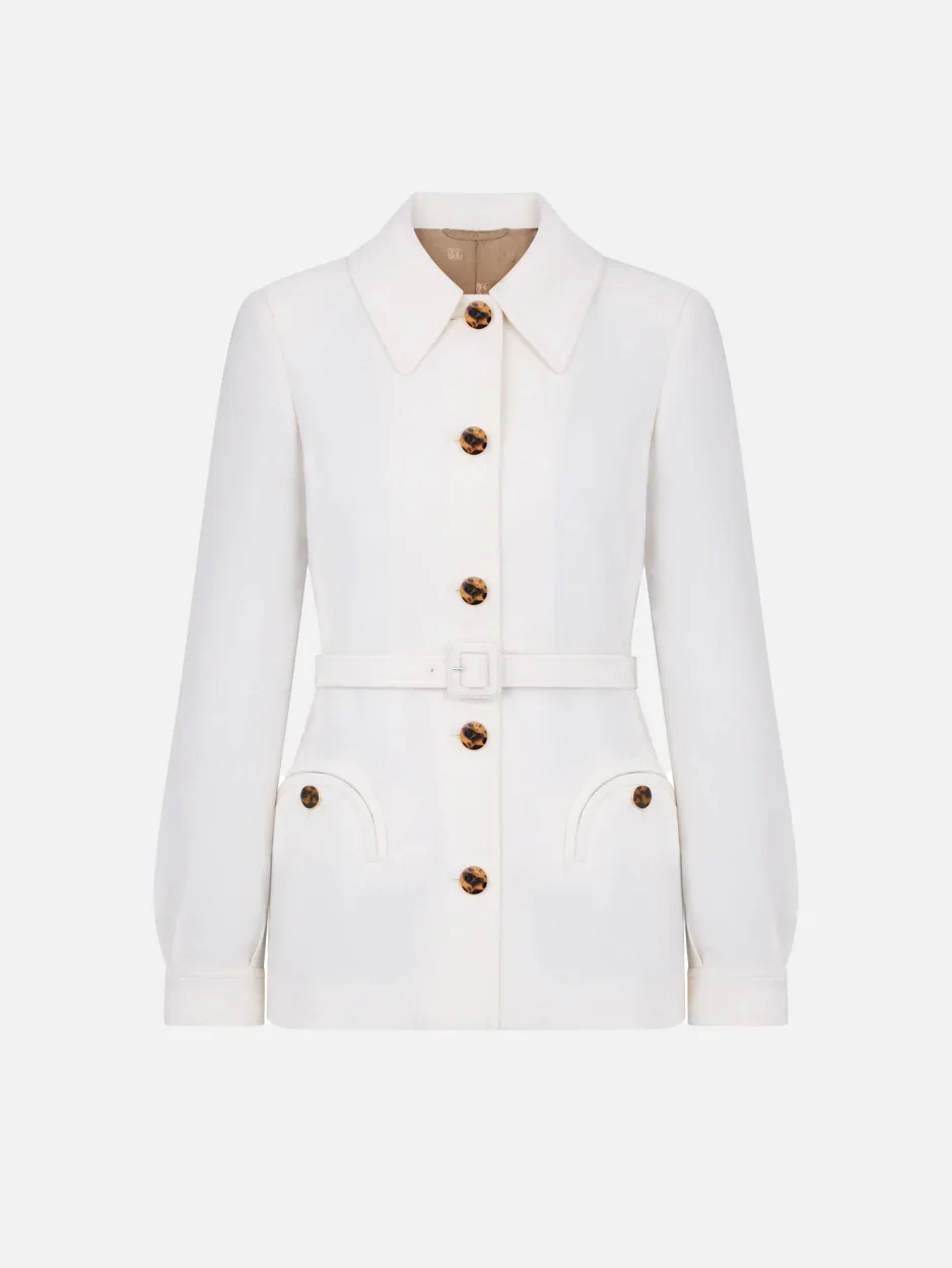 Women’s hourglass white wool crepe belted jacket Conceived as an urban reinterpretation of the hunting jacket, the Paint Jacket in white wool crepe combines tailored precision with functionality. The slim cut, enhanced by lightly padded shoulders and a fixed belt that defines the waist, shapes a sharp hourglass silhouette. Designed to carry you elegantly through the day, it moves effortlessly from formal looks to more casual pairings. Tortoiseshell logo buttons and the iconic Smiley pockets complete the piece with BLAZE Milano’s unmistakable signature. - Single-breasted - Hourglass shape - Slim fit - Lightly padded shoulders - Straight-point collar - Non-removable waist belt with fabric-covered buckle - Sleeves with buttoned cuffs - Tortoiseshell-effect buttons with engraved logo and brass base - External Smiley pockets - Camel lining with logo motif 100% Virgin wool Lining: Viscose Made in Italy
