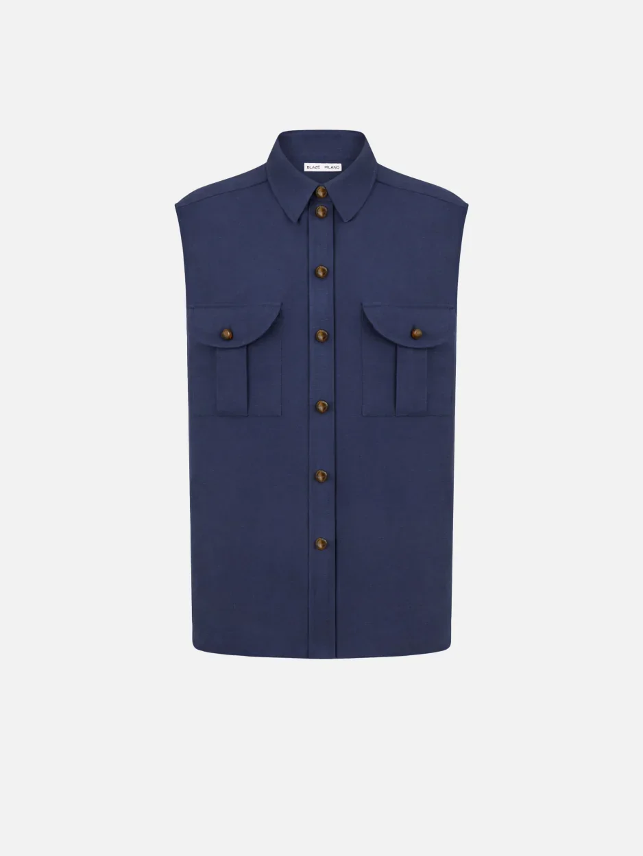 Sleveless shirt in linen and silk navy The sleeveless Savannah Navy Pekin Shirt, crafted from a blend of linen and silk, features glossy woven-effect buttons running up to a classic straight point collar and two signature Smiley chest pockets. It completes a fresh summer ensemble when paired with the matching skirt or pants. - Sleeveless design - Glossy loden inspired buttons - Straight point collar - Smiley chest pockets 59% Linen 41% Silk Lining: 100% Viscose Made in Italy
