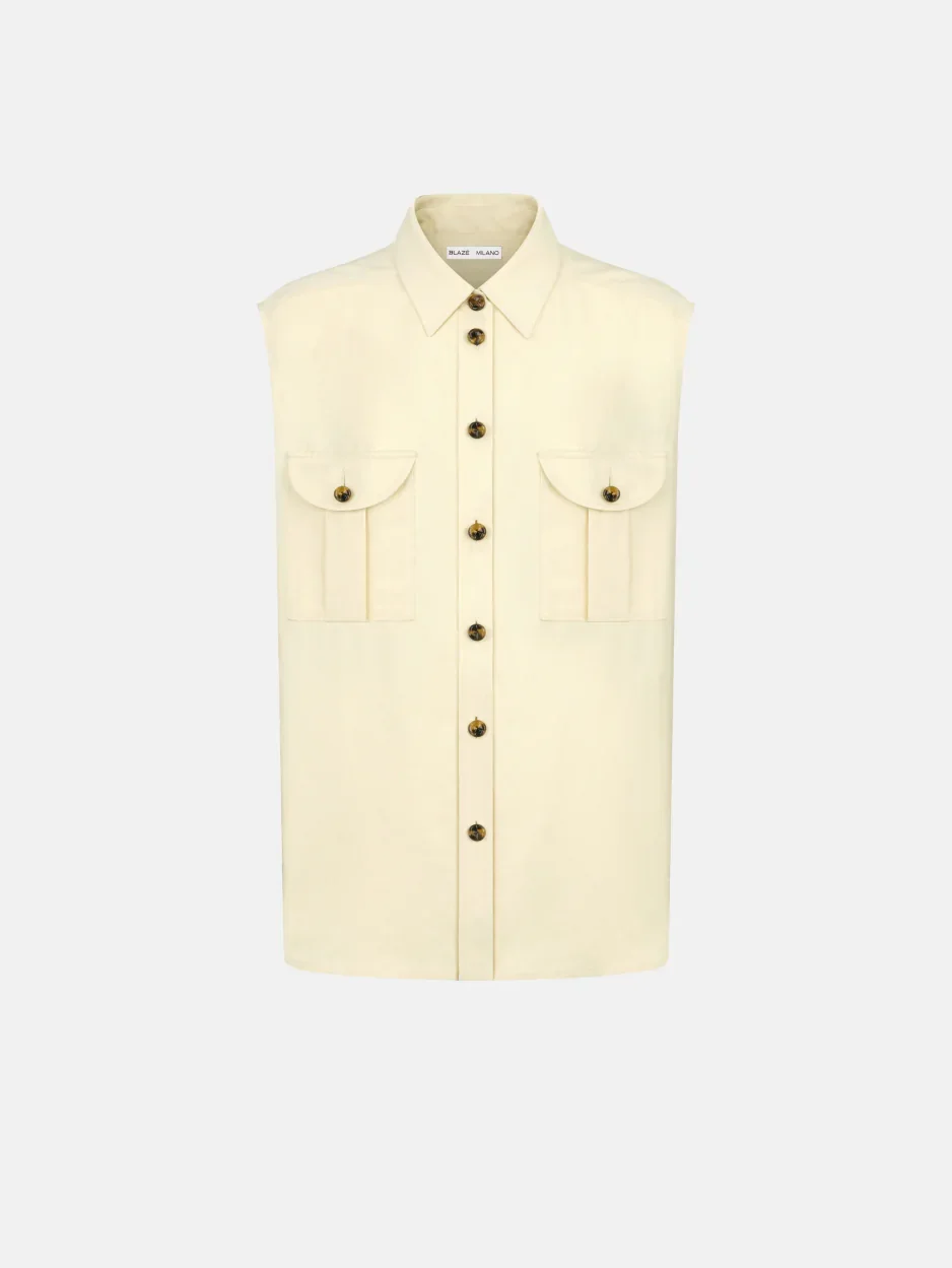 Sleveless shirt in linen and silk butter The sleeveless Savannah Butter Pekin Shirt, crafted from a lightweight silk-linen blend, features two Smiley-design chest pockets and glossy loden buttons. It pairs with the matching skirt for an all-cream, warm-weather ensemble. - Sleeveless, designed for a relaxed fit - Glossy loden buttons - Straight point collar - Smiley chest pockets 59% Linen 41% Silk Lining: 100% Viscose Made in Italy