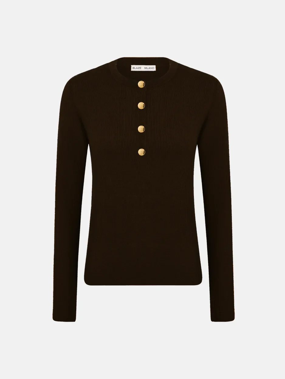 Cashmere and silk-blend brown ribbed sweater The Rolande is a cashmere and silk blend crewneck with a row of gilded buttons with the brand’s emblem. - Crewneck - Gold-tone metal logo buttons 70% Cashmere 30% Silk Made in Italy