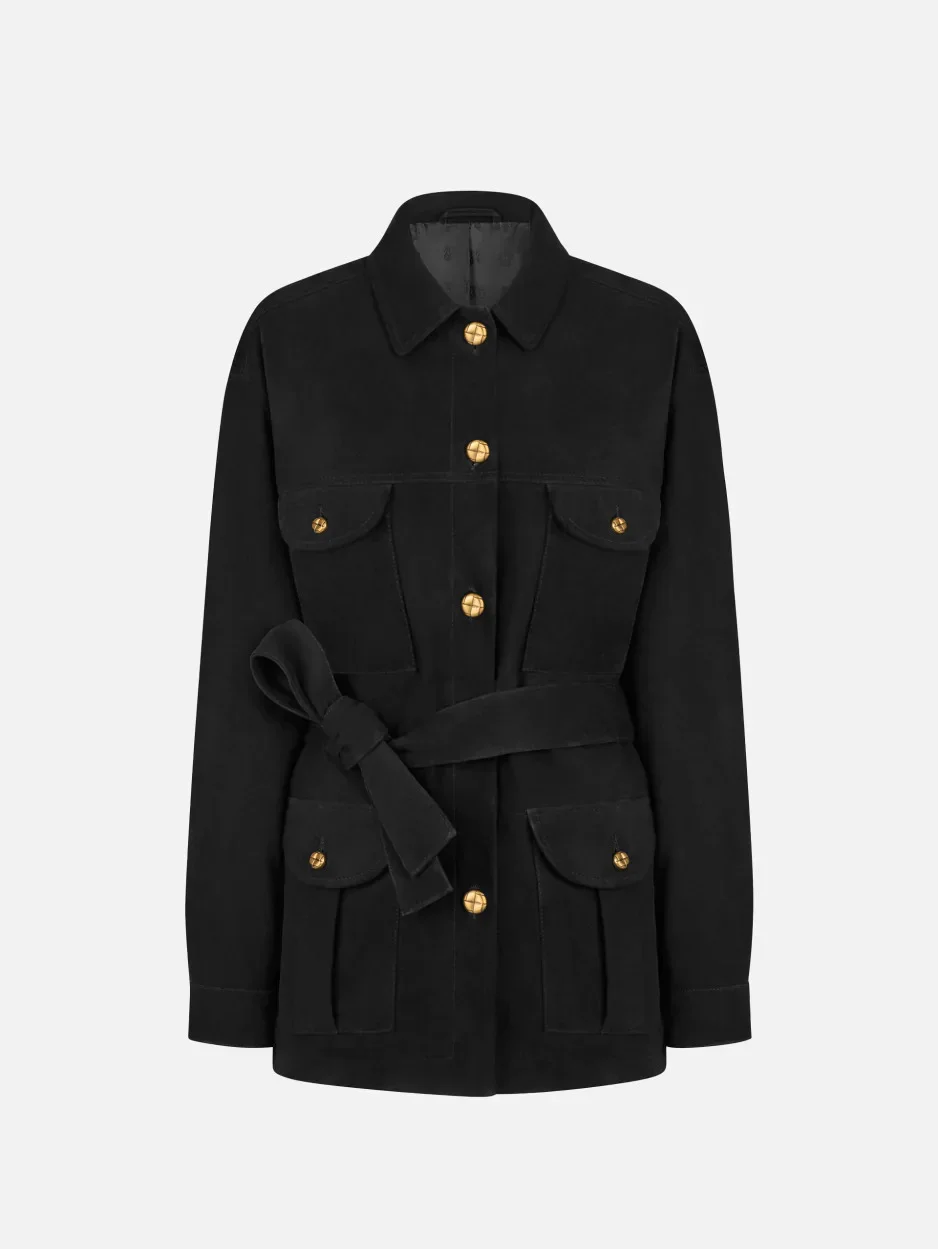 Women’s black suede safari jacket Ideal for both city dressing and travel, the Viva Black Sahariana is a true wardrobe essential. BLAZE Milano reinterprets the classic safari jacket—with its four utility pockets and relaxed fit—in premium black suede, complete with a waist belt to adjust the silhouette and gold loden-effect buttons for a subtle sparkle. - Relaxed fit - Four flap patch Smiley pockets with button closure - Sleeves with buttoned cuffs - Gold-tone loden-effect buttons - Removable waist belt - Black lining with logo motif 100% Lambskin Lining: Viscose Made in Italy