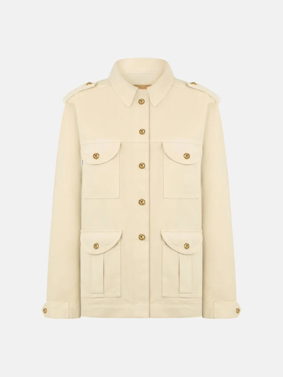 Sahariana jacket in beige denim BLAZE Milano Denim introduces the Sahariana style this season in soft almond beige, with a utilitarian feel marked by four Smiley patch pockets and epaulettes – to be worn with everything, including the matching Java jeans. -Safari style - Intended as a relaxed fit, cut below the hips - Mini loden-inspired metal buttons - Four Smiley utility pockets 100% Cotton Made in Italy