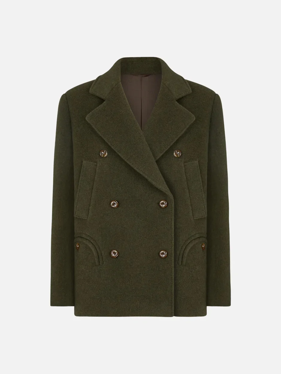 Women’s double-breasted cardamom green wool and cashmere coat The timeless sailor-inspired peacoat finds a new interpretation in BLAZE Milano’s Foners Sealady Coat. Crafted from a soft blend of wool and cashmere and presented in an original cardamom green hue, this clean-lined coat strikes the perfect balance between functionality and impeccable style. - Double-breasted - Regular fit - Tortoiseshell-effect loden-effect buttons - Side Smiley pockets and two slanted chest slit pockets - Dark chocolate lining with logo motif 90% Wool 10%Cashmere Lining: Viscose Made in Italy
