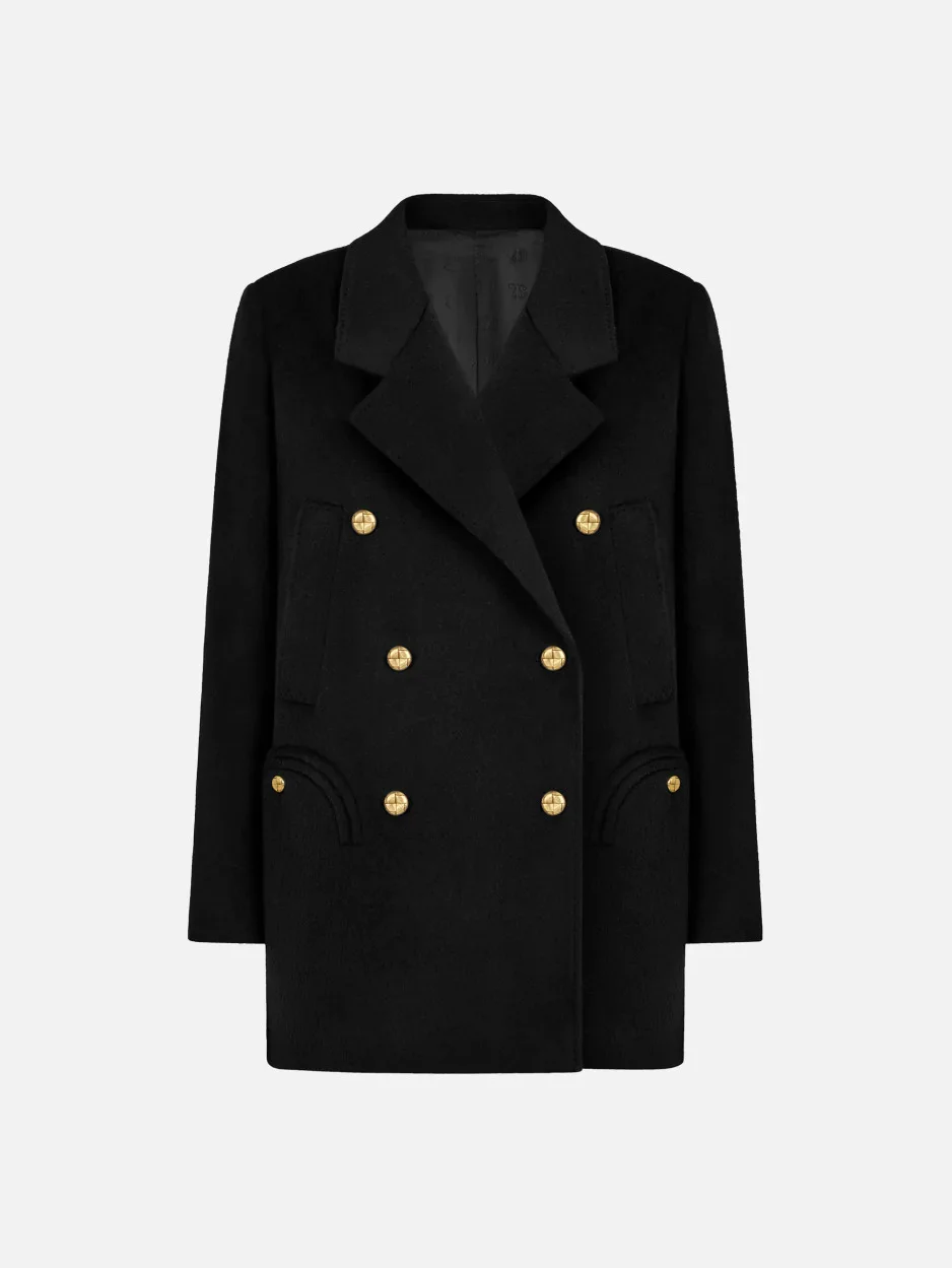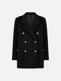 Women’s double-breasted black wool and cashmere coat The classic double-breasted peacoat-style jacket in black wool, with loden-style gilded buttons, side pockets and two generous Smiley pockets. - Double-breasted - Boxy cut - Lightly padded shoulders - Navy lining - Loden-effect brass buttons - Classic lapels - External Smiley pockets and side pockets 90% Virgin Wool 10% Cashmere Lining: Viscose Made in Italy
