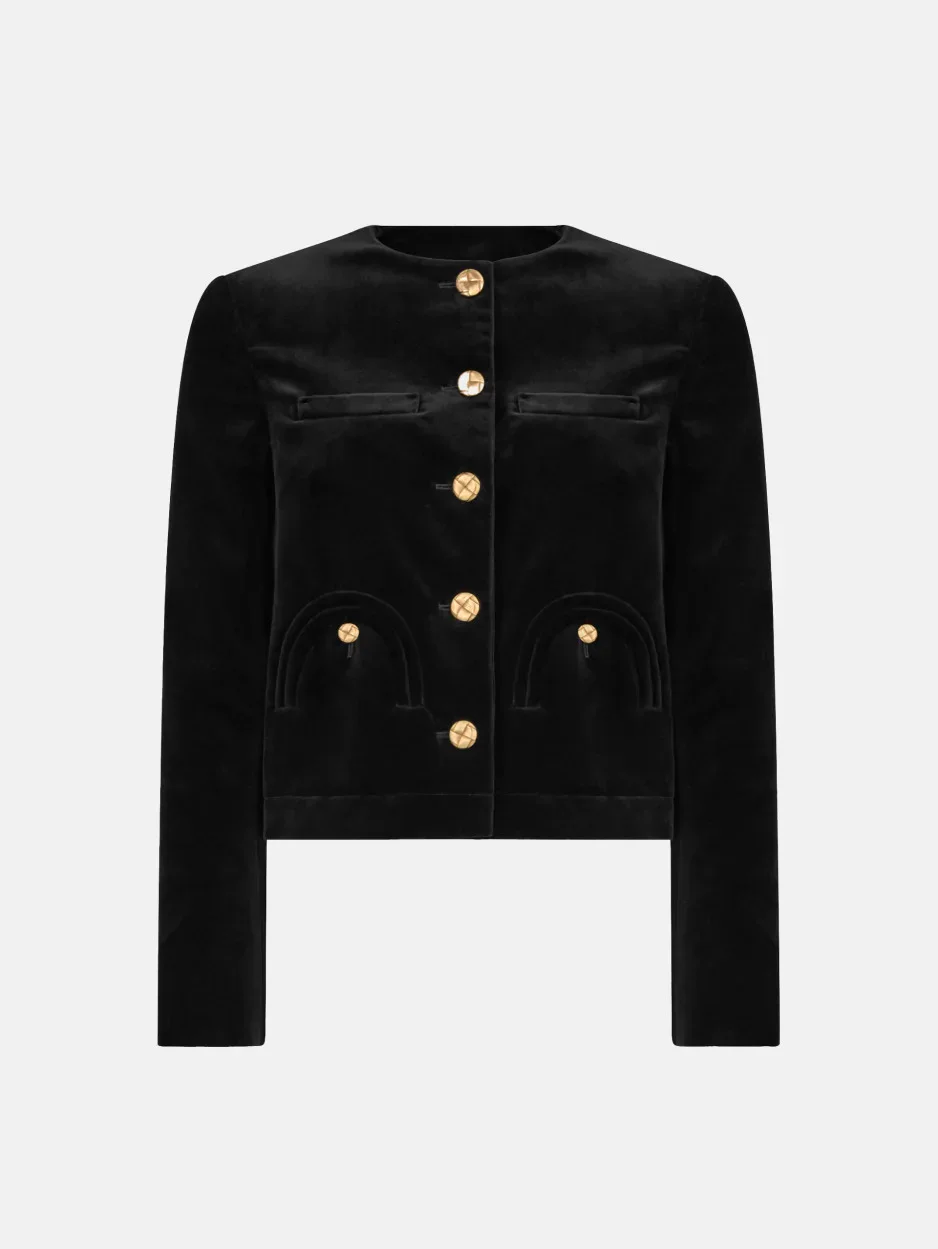 Women’s black velvet bolero jacket In BLAZE Jealousy Black cotton velvet, the Shamo Bolero showcases a slim silhouette, cropped just above the hips. Accentuated by gold-toned buttons, it suits with the matching pants for a complete look. - Fits true to size with lightly padded shoulders - Cropped design, cuts above the hips - Navy coloured lining - Loden-inspired metal buttons - Smiley outer pockets and one internal pocket 100% Cotton Lining: 100% Viscose Made in Italy