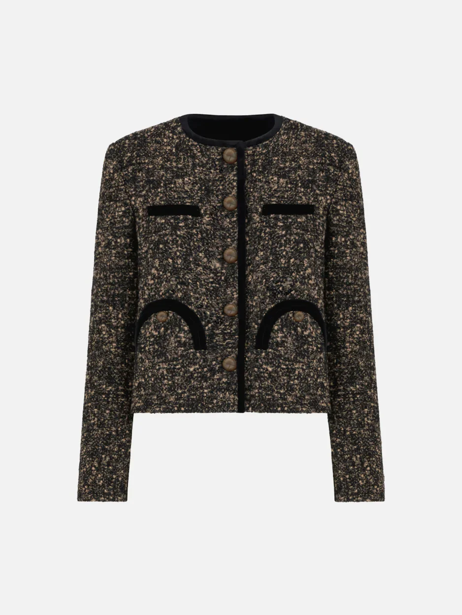 Velvet-trimmed boucle-tweed bolero jacket BLAZE Milano’s collarless, cropped bolero jacket, now in black and beige boucle wool, with black velvet-edged neckline, hems and pockets. To pair with the matching miniskirt. - Fits true to size with lightly padded shoulders - Cropped design, cuts above the hips - Crest-embossed metal buttons - Smiley outer pockets and one internal pocket 44% Wool 38% Alpaca 18% Polyamide Lining: Viscose Made in Italy