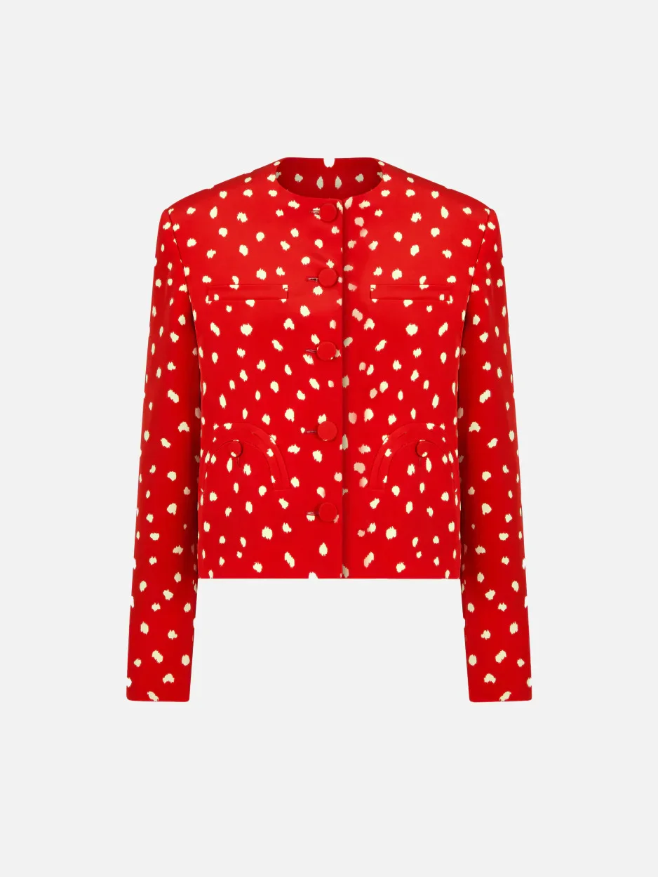 Women’s red silk bolero jacket with white polka dots The Shamo Bolero is reimagined in red silk with polka dots. Inspired by the Pointillism movement, the new print introduced for Resort 2026 pays homage to summer’s carefree spirit and complements the jacket’s minimalist lines, offering a playful yet contemporary elegance. - Oversized fit, cropped design - Lightly padded shoulders - External Smiley pockets, two chest slit pockets and one internal pocket - Fabric-covered buttons - Rose lining with logo motif 100% Silk Lining: Viscose Made in Italy