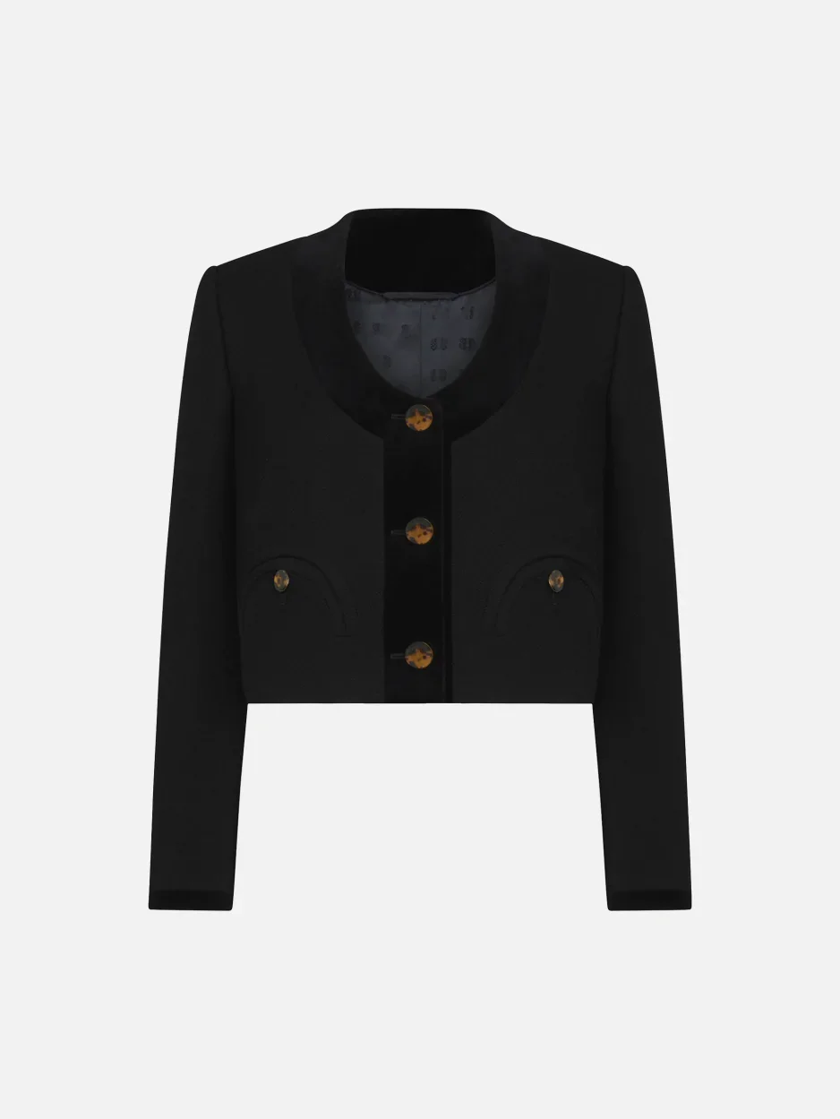 Cropped cotton velvet-trimmed black viscose jacket A cropped bolero-style jacket in lightweight black viscose with wide velvet trim along the collar and hems. And the all-important BLAZE Milano details: tortoiseshell-effect button and little smiley pockets. Pairs perfectly with the matching Husi trousers. - Cropped design, cuts above the hips - Lightly padded shoulders - Navy lining - Glossy tortoiseshell-effect buttons - External Smiley pockets and one internal pocket 100% Viscose Lining: Viscose Made in Italy