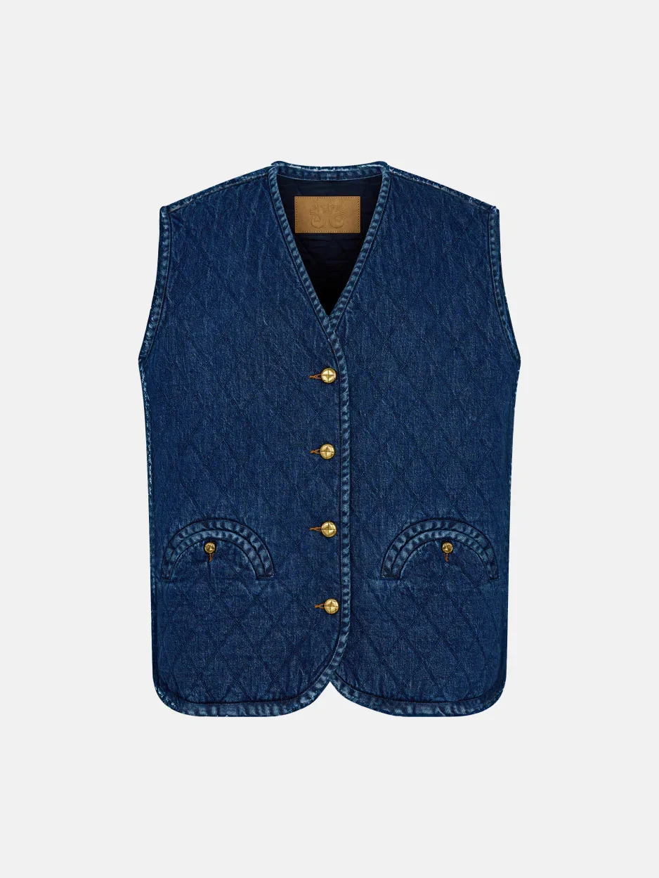 Denim quilted gilet Sleeveless used-look denim gilet with matelasse-stitch details, small gilded loden-effect buttons and contrasting rust-colored stitching. - Mini loden-inspired metal buttons - Matelasse-stitch details - External Smiley pockets 100% Cotton Lining: Polyester Made in Italy