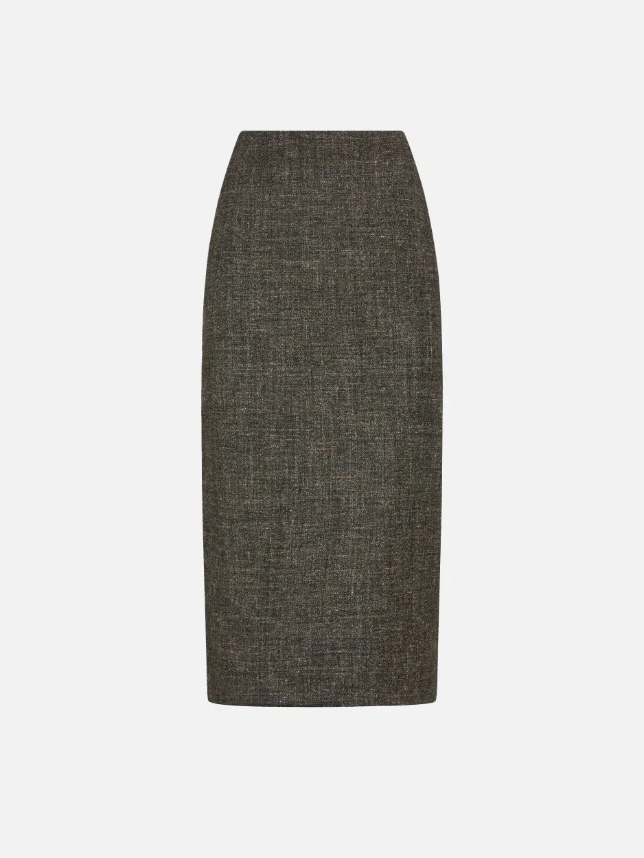 High-waisted midi skirt in grey melange wool and linen The Siranui Sussex Longuette is presented in a sophisticated grey melange, one of the key shades of the season. With its classic elegance, it transitions effortlessly from work commitments to social occasions. A versatile piece to wear with everything, it finds its perfect match in the coordinating Ares Blazer. - Midi length - High-rise - Slim fit - Concealed zip fastening along back - Back vent - Grey lining with logo motif 45% Virgin wool 27% Linen 18% Polyamide 10% Cotton Lining: Viscose Made in Italy