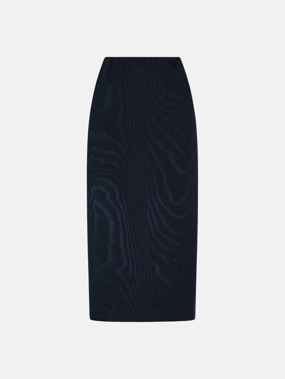High-rise midi skirt in navy watered viscose A dark blue cotton/viscose moire skirt with a figure-accentuating high waist. Hits mid-calf, with a high-cut slit in back for ease of movement. Paired with the matching Ares Blazer, it makes a chic, captivating ensemble. - Midi length for a slim fit - High-waisted design - Back slit for ease of movement - Concealed back zip closure 55% Viscose 45% Cotton Linings: 100% Viscose Made In Italy