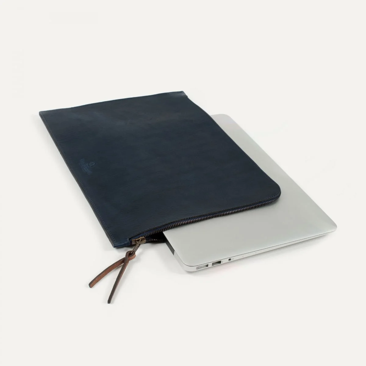 LEATHER LAPTOP SLEEVE Made of beautiful vegetable tanned leather, the Jim Laptop sleeve has been specially designed for a 13-inch laptop. Dark blue tinted sides. Zip closure. Size: 35 cm x 25 cm Handmade in France. MATERIALS - Vegetable tanned leather using natural agents such as mimosa, chestnut, acacia. - Natural and soft touch finish. - Backside leather with 'velvet' finishing. - YKK Excella zip, polished with a bronze finish. SIZE Size: 35 cm x 25 cm