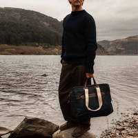 CABIN TRAVEL BAG The Missak travel bag is more than just a piece of luggage: it is an invitation to travel, to dive into the world of the pioneers of aviation. Taking inspiration from the bags used in the cramped cockpits of the early 20th century, it combines the authenticity of this legendary model with a functionality fit for the present day. Made from British Millerain waxed canvas: light, sturdy, and easy to maintain, the Missak can withstand anything: rain, dust, or unexpected adventures. This high-quality twill cotton canvas (590g/m²) provides great protection for your belongings, while retaining a fine texture and soft touch. It has a large, practical opening giving you quick access to all your essentials, and with its cabin-bag dimensions you can take this stylish, functional bag with you everywhere. A large zipped pocket on the back provides an extra compartment so you can keep your most precious belongings close at hand. Dimensions: L47.5cm x H37cm x D22.5cm Volume: 30L Made in France. The inside zipped pocket is dated and signed by the artisan who made the bag. The Missak bag is equipped with two side buckles allowing the addition of a shoulder strap for carrying over the shoulder or across the body. Compatible with the Bandouliere Mousqueton - Pain Brule (sold separately). MATERIALS The Missak travel bag is made from 18oz lick wax tweed canvas from the British Millerain brand. This 590g/m² canvas is a cut above the rest, with its super-close weave giving it exceptional resistance to wear and stretch and making it an essential fabric for leatherwork and luggage. The carefully-applied dry wax gives it a non-greasy feel and provides full protection against the weather, ensuring durability and comfort in urban environments. - Details and handles in vegetable-tanned leather - Beige straps - Zipped closure with YKK zipper - Large rear zipped pocket - Inside removable zipped pocket dated and signed by the artisan who made the bag - Bleu de Chauffe label SIZE - Cabin-luggage sized - Dimensions: L47.5cm x H37cm x D22.5cm - Volume: 30L - Dimensions of rear zipped pocket: L47cm x H25cm Dimensions of handles and straps Handle length: 35cm Strap length: 70cm Strap drop length*: 29cm Handle width: 2cm Strap width: 4cm, 2cm in the middle *the drop length is the distance between the top of the bag and the top of the strap. The handles and straps have been designed to make the bag incredibly versatile: it can be carried in the hand using the handles or over the shoulder with the straps. Their width ensures the weight is spread evenly and gives a good grip, ensuring optimal comfort even when carried for a long time.