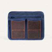 MULTI-COMPARTIMENT POCKET A simple and stylish cotton and leather multi-compartment pocket for all your essentials. The pouch fits into all Bleu de Chauffe bags thanks to the SNAP system (not including Joan/Jordi bags, Pastel S and L bags ). Size: L 22,5 x H 17,8 cm Each pouch is made in France. MATERIALS - Cotton canvas and vegetable tanned leather. - Metal closing zipped SIZE - Size: L 22,5 x H 17,8 cm - One big zipped pocket. - Two folp-up pockets (for pens and so on) - Four patch pockets for your cards, USB keys...