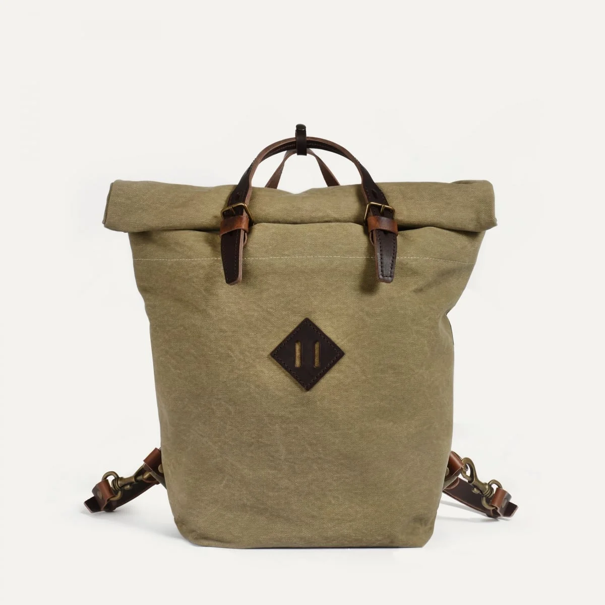 MEN'S AND WOMEN'S ROLL TOP BACKPACK The Woody is the quintessential Bleu de Chauffe canvas bag, with an outdoor, ‘military’ disposition that makes this range unique. The 25L Woody backpack is a reinvention of old climbing bags. You can wear it as a traditional backpack, or as a hand luggage, thanks to its handles. The Woody backpack is made from stone washed cotton canvas. This high-quality canvas provides complete protection for your belongings, with a stylish weave that is soft to the touch. The vegetable-tanned leather handles, strap, and details add a touch of class while strengthening the bag. The bag integrates 2 outside compartments with a top magnetic closure or a zipper for your accessories as cell phone, wallet, passeport, notebook….It has high storage capacity and fits perfectly for your belongings and a 13” laptop or 15" laptop. The Woody backpack is compatible with the Milan laptop sleeve thanks to the SNAP system. The Bleu de Chauffe label, signed and dated by the artisan, is sewn on an inside zipped pocket. Size : H 42 x L 35 x W 17 cm Volume: 25 liters. Handmade in France. The Woody backpack can be completed with our “PECT” chest strap sold separately (Palissander color), for bike or motorcycle use. MATERIALS Made with the same cotton canvas fabric used to renovate the famous Jeep Willis collector hood. The Bleu de Chauffe canvas is supplied by the very last French canvas manufacturer. - Details in vegetable-tanned leather - Felt shoulder straps for more comfort. - One outside zipped pocket: 27 cm (H) x 19 cm (L) - One outside back pocket with magnetic button closure: 15 cm (H) x 22 cm (L) - One outside front pocket: 16 cm (H) x 20 cm (L) - Inside removable zippered cotton pocket. - Metal details with a bronze finish. - Embossed Bleu de Chauffe logo with a bronze sheen. SIZE - External dimensions: H 42 x L 35 x W 17 cm - Internal dimensions of main compartment: H 41 x L 34 x W 17 cm (for laptops up to 15 inches) - SNAP concept: Thanks to the SNAP concept, you can add a "Milan" felt computer cover to the inside of the backpack to suit your needs. (sold separately) - Volume: 25 liters. We recommend measuring your computer to check it will fit. The braided Leather keychain shown in the photo of the mannequin is sold separately.