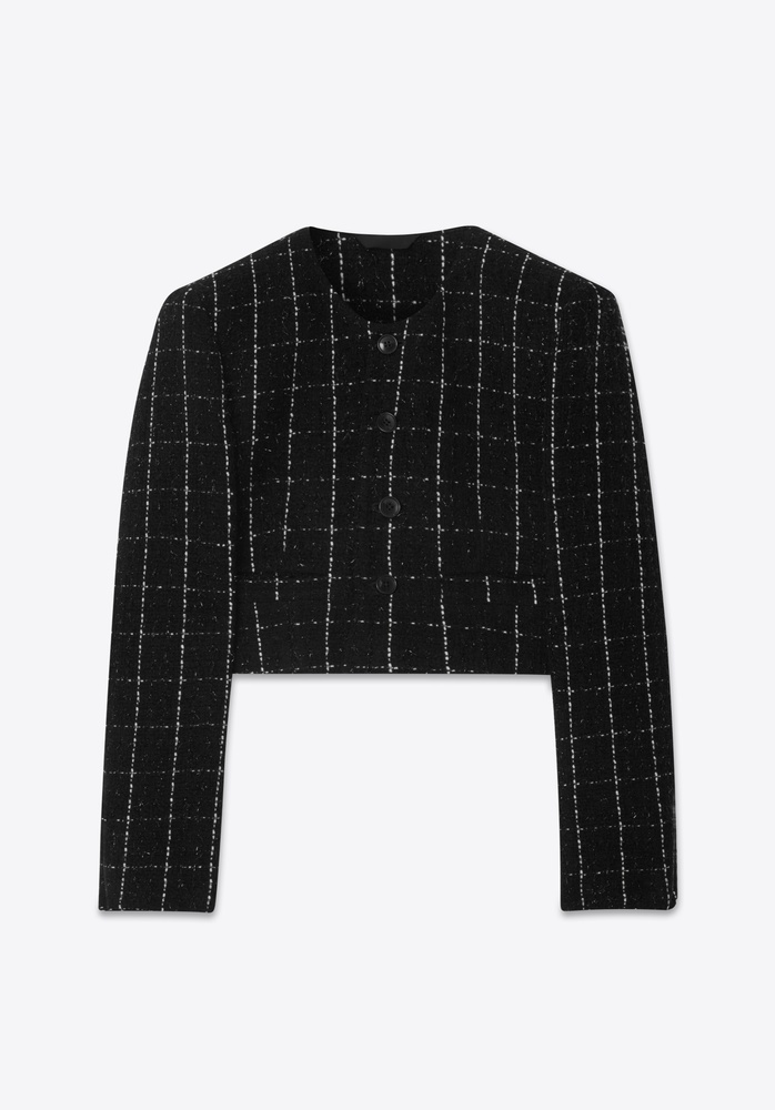 Jacket with round neck in black and white boucle. MORE DETAILS - Cropped slim fit - Four button closure - Two horizontal welt pockets at front - Light shoulder pad - Roped shoulders - Two open sleeve slits at cuffs - Fully lined with two internal pockets