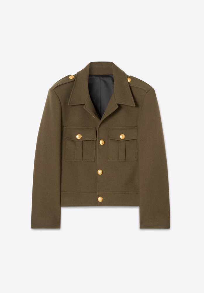 70s inspired single-breasted cropped military jacket with patch chest pockets. Five gold crest button front closure. MORE DETAILS - 100% Wool - Slim cropped fit - Two patch pockets at chest with flaps - Gold crest buttons - Two inside pockets - 100% Viscose lining - Fully lined