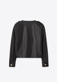 Boxy 80s inspired collarless jacket in soft lamb leather, with 10 button closure, two slanted welt pocket at waist.