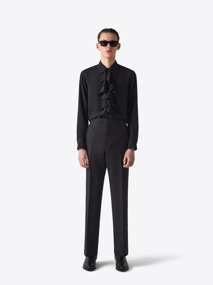 Silk with modern 70s inspired collar and frill front. MORE DETAILS - 75% Acetate 25% Silk - Classic fit - Pleat at back - 70 inspired Collar - Front button closure - Single button sleeve cuffs - Puffed sleeves