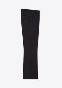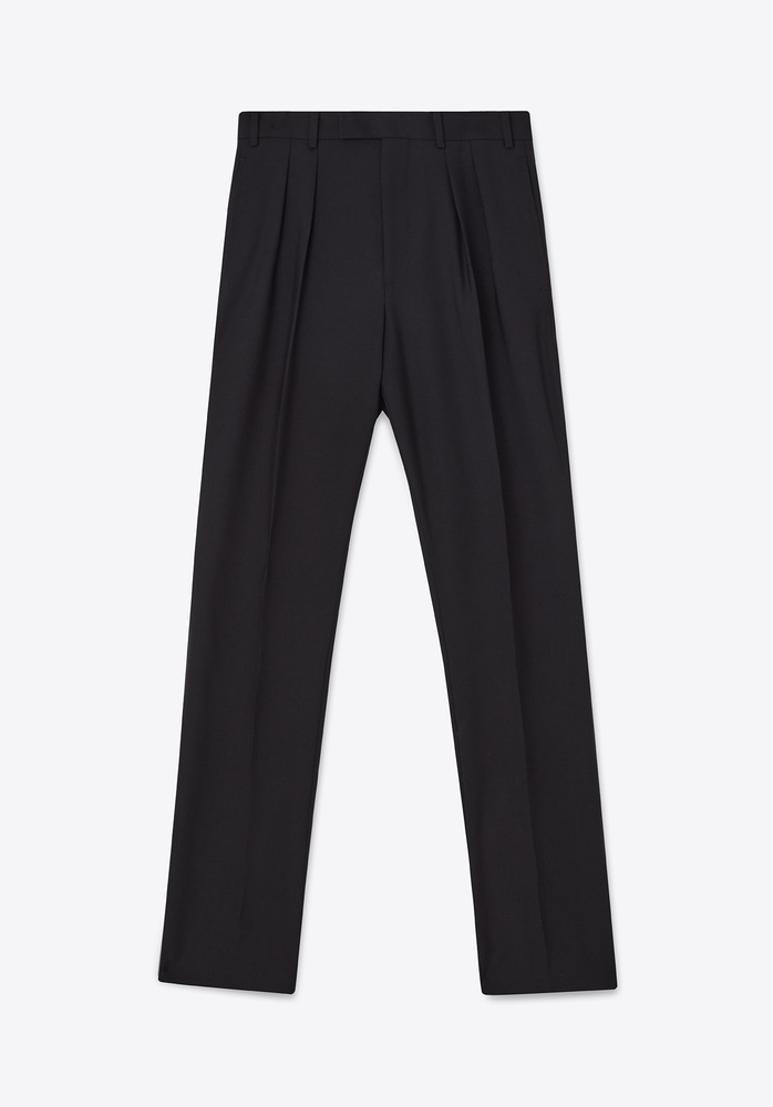 Flat front double pleated 50s straight cut pant in wool mohair. MORE DETAILS - 100% Wool mohair - Straight pant - Double front pleats - Zip and button closure - Side seam pockets and two front pleats - Two jetted pockets at back - Waist band with belt loops - Decorative AMF stitches