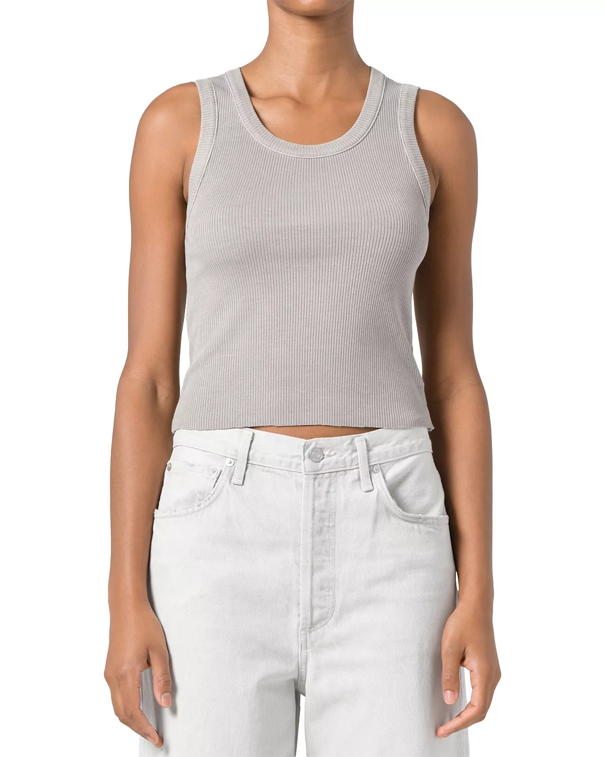 SIZE & FIT - Fits true to size, order your normal size - Designed for a slim fit - Model measurements: 5'10" height, 33" bust, 25" waist, 35" hips, wearing a size 27 PRODUCT DETAILS - Scoop neck - Sleeveless - Pullover style - Ribbed - Made in USA of Imported Materials Web ID: 5416553 MATERIAL & CARE - 49% organic cotton\ 49% lyocell \ 2% spandex - Machine wash cold