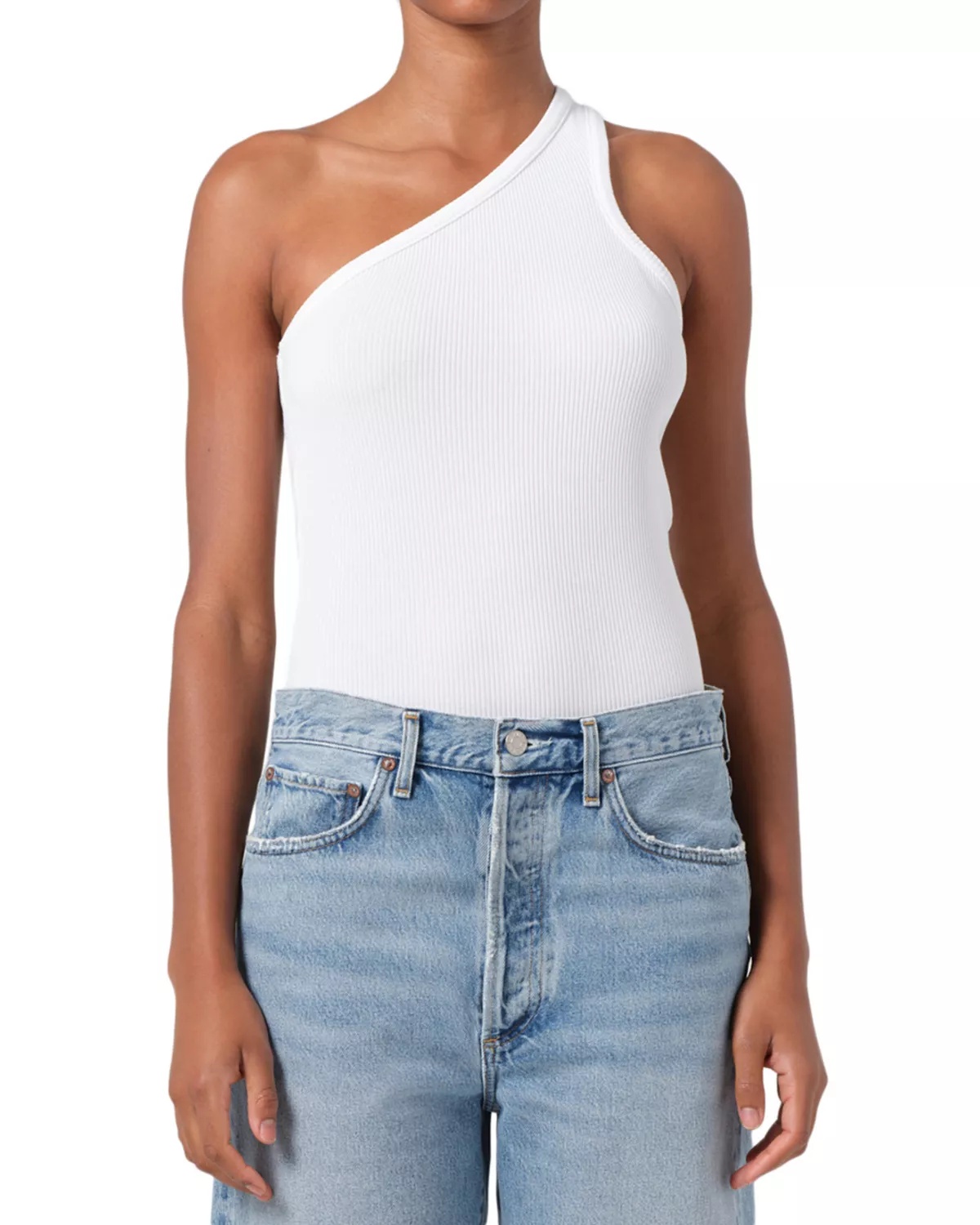 SIZE & FIT - Fits true to size, order your normal size - Model measurements: 5'10" height, 33" bust, 25" waist, 35" hips, wearing a size 27 PRODUCT DETAILS - Asymmetrical neck - Single shoulder strap - Pullover style - Ribbed - Made in USA Web ID: 5416554 MATERIAL & CARE - 49% cotton/49% lyocell/2% spandex - Machine wash