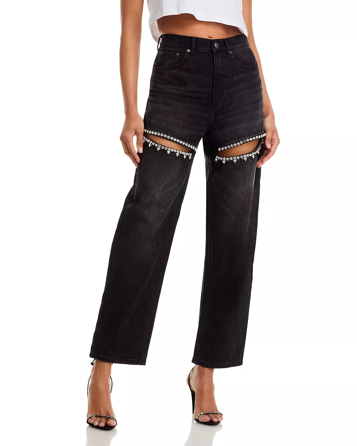 SIZE & FIT - Fits true to size, order your normal size - Rigid Jeans: This non-stretch denim provides a structured fit and takes time to break in. It will become more comfortable with each wear! - Rise: 11.5" - Inseam: 27.5" - Leg opening: 15" - All measurements based on a size 26 - Model measurements: 5'10" height, 33.5" bust, 23.5" waist, 34.5" hips, wearing a size 26 PRODUCT DETAILS - Zip fly with button closure, four-pocket silhouette - Contrast stitching, silver-tone hardware, belt loops - Whiskered, faded, slits with rhinestones at leg - Straight-leg silhouette - Imported Web ID: 5594347 MATERIAL & CARE - 100% cotton - Dry clean