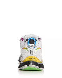 SIZE & FIT - In 1917, one of the most storied and influential houses in fashion history was founded in San Sebastian, Spain, by Basque-born couturier Cristobal Balenciaga. A move to Paris in 1937 paved the - way for Balenciaga to step into the international spotlight, as the master tailor and visionary designer debuted a slew of now-iconic sculptural silhouettes from cocoon coats to tunic dresses, before - retiring in 1968 and effectively closing the house's doors for decades. Along with Nicolas Ghesquiere, who served an award-winning stint at the label's helm from 1997 until 2012, - current creative director and Vetements cofounder Demna Gvasalia is widely credited with reviving the house to its former glory. Inspired by both the Balenciaga archives and modern streetwear - aesthetics, Gvasalia creates highly covetable pieces like sock sneakers and logo-print totes. PRODUCT DETAILS - Fits true to size, order your normal size - Padded tongue and collar for optimal comfort - Lace up - Distressed detailing - Faux leather overlay details - Size detail at heel and toe - Pull tab at heel - Updated sole based on iconic Balenciaga Track silhouette - Logo at tongue, laces, sole edge and heel - Polyester and polyurethane upper, polyester lining, rubber sole - Imported Web ID: 5879644