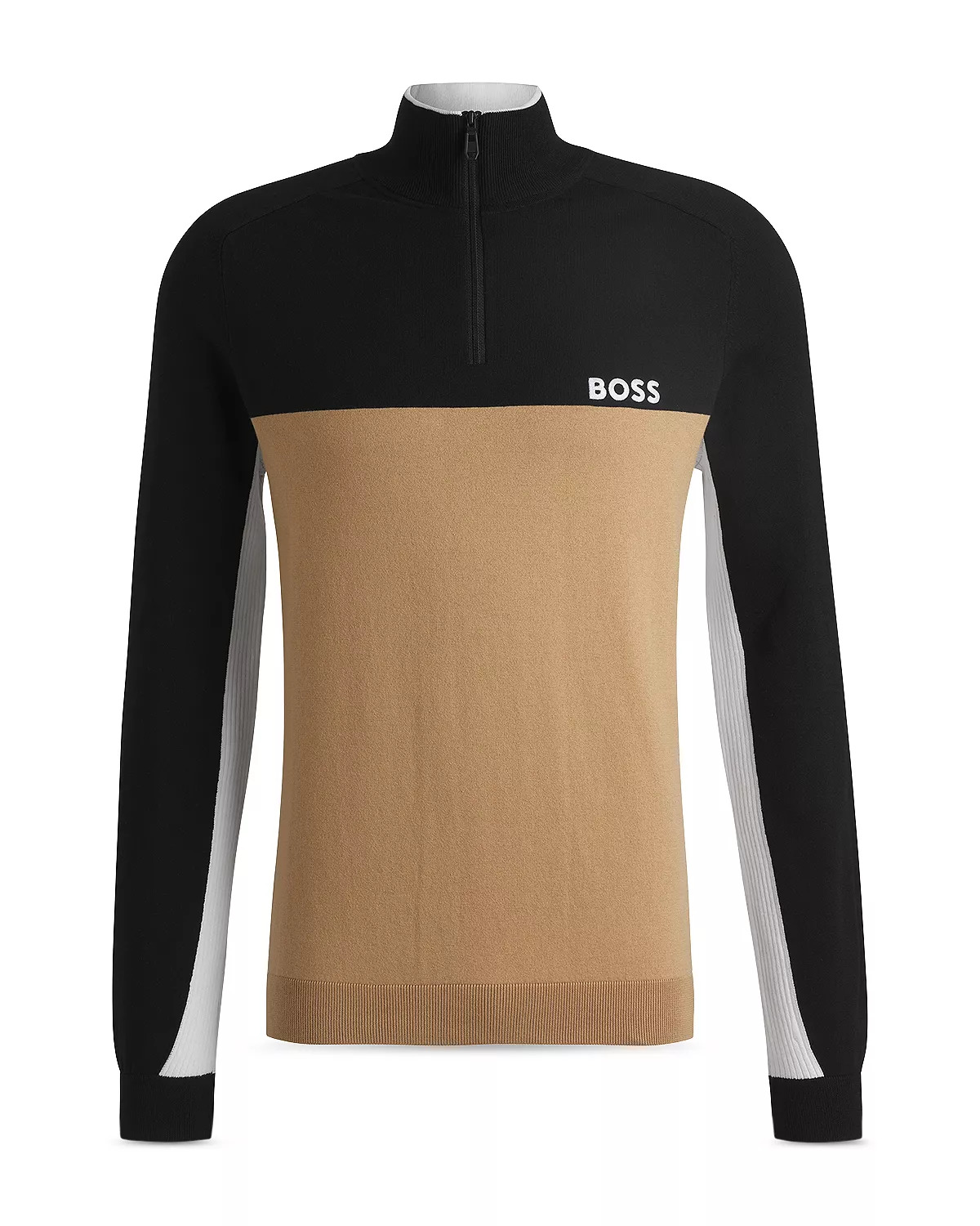 SIZE & FIT - Fits true to size, order your normal size - Designed for a regular fit PRODUCT DETAILS - Zip-through neck - Quarter-zip closure - Long sleeves with ribbed cuffs - BOSS lettering at left chest, textural BOSS lettering down center back - Made in Turkey Web ID: 5865582 MATERIAL & CARE - 82% cotton/17% polyester/1% elastane - Machine wash