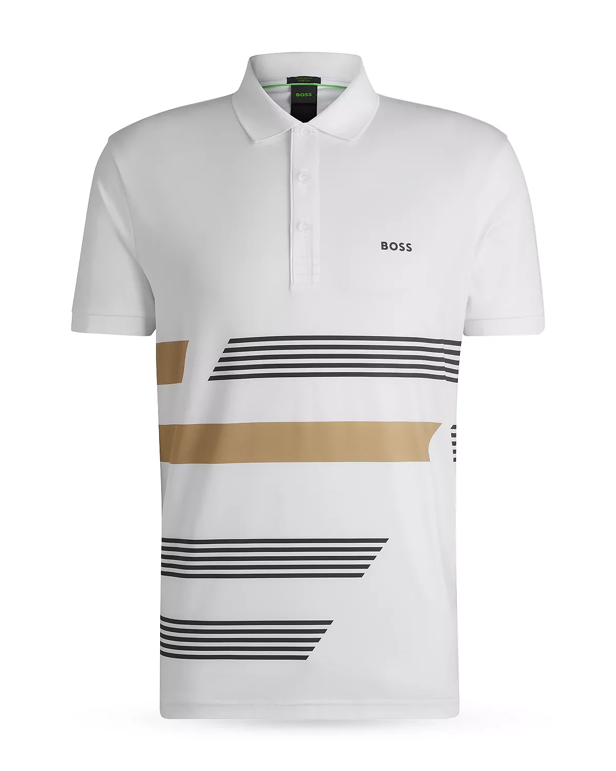 SIZE & FIT - Fits true to size, order your normal size - Designed for a regular fit PRODUCT DETAILS - Flat-knit spread collar - Three-button placket - Short sleeves with flat-knit cuffs - BOSS lettering at left chest, horizontal stripes on front and back - Imported Web ID: 5865584 MATERIAL & CARE - 92% polyester/8% elastane - Machine wash
