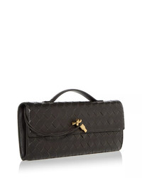 PRODUCT DETAILS - Top handle - Dimensions: 12.2"W x 1.2"D x 5.1"H - Metallic knot flap closure - Interior slip pocket, six interior card slots - Signature intrecciato woven leather - Brass-tone hardware - Mannequin model measurements: 5'10" height, wearing a size 4 or small - Lined - Leather - Made in Italy Web ID: 5007728