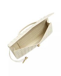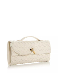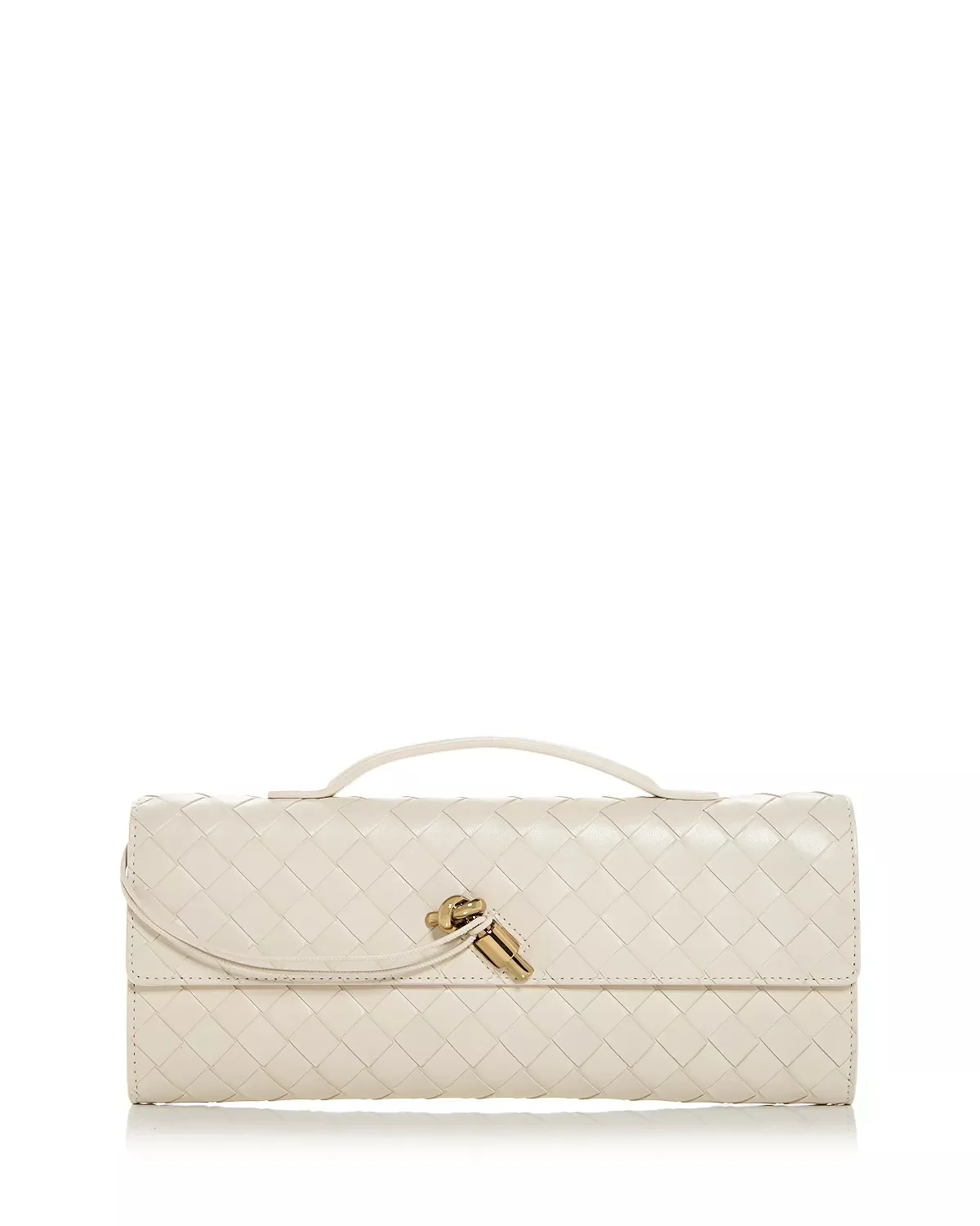 PRODUCT DETAILS - Top handle - Dimensions: 12.2"W x 1.2"D x 5.1"H - Metallic knot flap closure - Interior slip pocket, six interior card slots - Signature intrecciato woven leather - Brass-tone hardware - Mannequin model measurements: 5'10" height, wearing a size 4 or small - Lined - Leather - Made in Italy Web ID: 5007728