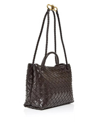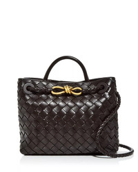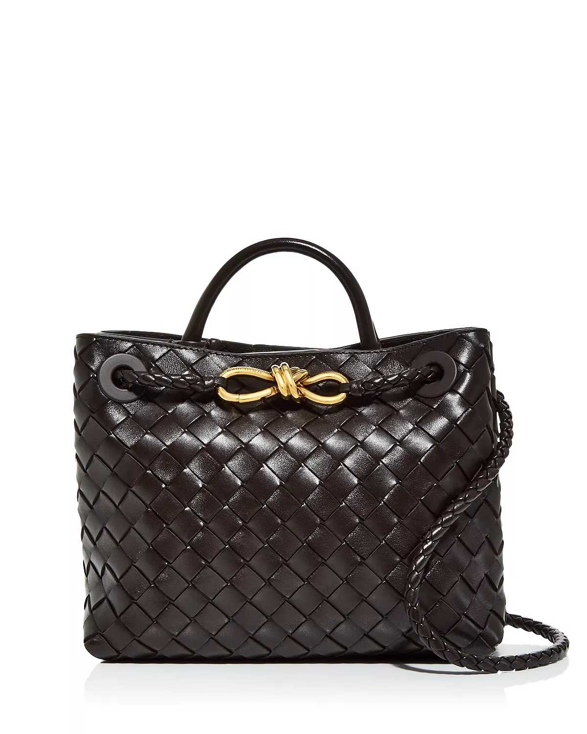 PRODUCT DETAILS - Top handle - Shoulder strap - Dimensions: 9.8"W x 4.13"D x 8.67"H - Magnetic tab closure - Two interior compartments - Interior zip pocket and slip pocket - Woven design - Brass-tone knot hardware - Leather - Made in Italy Web ID: 4622483